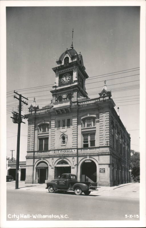 Exterior view of the ornate brick City Hall building with a clock tower, which also houses the Police and Fire Departments. The year 1907 is visible on the facade. A vintage pickup truck for the "Water & Street Depts." is parked on the street in front. A sign for the Martin County Health Dept. is also visible. |