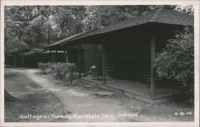 Black and white photograph of rustic wooden cottages with covered porches in a wooded area. A dirt path runs in front of the cottages, and there are chairs, including rocking chairs, on the porch of the closest cabin.