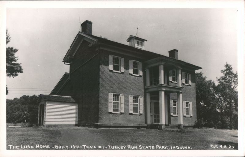 | A black and white real photo of a two-story brick building with white shutters on the windows and a two-story front portico. There are two brick chimneys and a small cupola on the roof. A smaller, single-story white clapboard extension is attached to the side. The text at the bottom reads "The Lusk Home - Built 1841 - Trail #1 - Turkey Run State Park, Indiana.". |