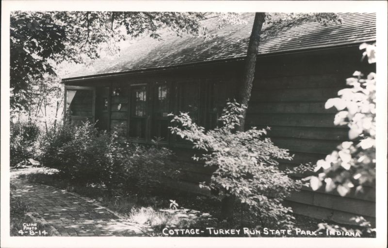 Black and white view of a rustic wooden cottage surrounded by trees and bushes. A brick pathway leads alongside the house. The photograph is marked "CLINE PHOTO" in the lower left corner.