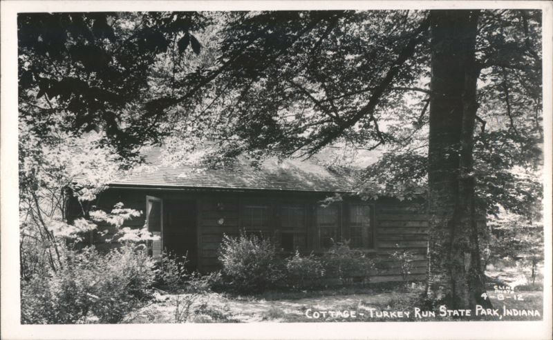 A rustic wooden cabin with an open screen door, nestled among trees and bushes.