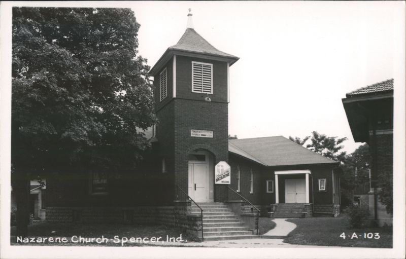 Exterior view of a brick church with a corner bell tower and stone foundation. A large deciduous tree is visible to the left. A sign on the lawn says "Church of the Nazarene WELCOME".