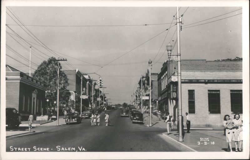 | Black and white view looking down a main street lined with 1940s automobiles. Pedestrians are on the sidewalks and crossing the street. Businesses visible include The Bank of Salem with a large clock and Salem Hardware Co. A U.S. Route 11 sign is posted on a utility pole. |