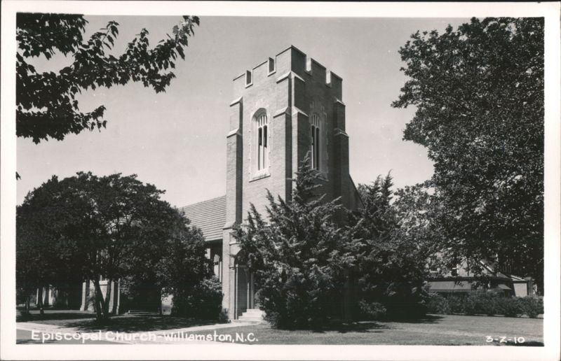 A black and white real photo view of a brick church with a castellated tower. The building is surrounded by a lawn and numerous mature trees.