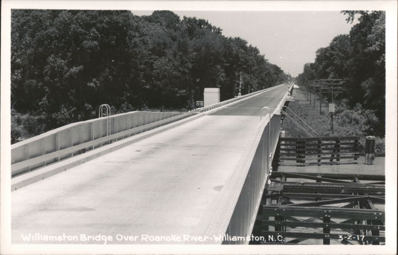 Black and white real photo view looking down the length of a bridge, with dense trees on both sides. A portion of an older wooden trestle bridge is visible on the right.