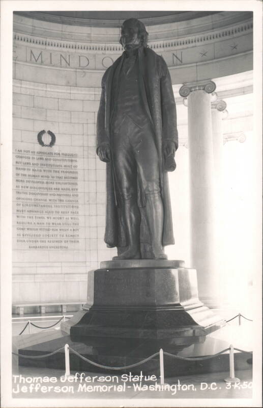 Interior view of the memorial showing the full-length bronze statue of Thomas Jefferson on a dark pedestal. A quote from Jefferson is inscribed on the marble wall behind the statue, beginning with "I AM NOT AN ADVOCATE FOR FREQUENT CHANGES IN LAWS AND CONSTITUTIONS". The statue is surrounded by a rope stanchion.