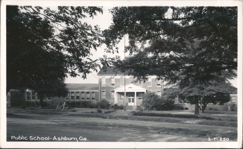 | Black and white view of a two-story brick school building with a central entrance portico and single-story wings. The building is framed by large trees in the foreground, with a grassy lawn and some playground equipment visible to the left. |