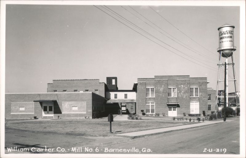 View of the brick factory buildings. A water tower on the right is painted with "Carter's UNDERWEAR for the entire family". A street, sidewalk, and lawn are in the foreground.