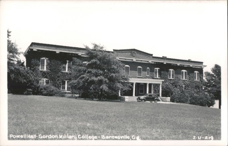 Black and white view of a large two-story brick building covered in ivy. A vintage car is parked by the front steps of a portico with columns. A large lawn is in the foreground.