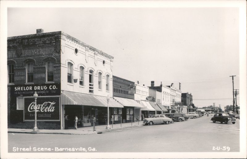 | Black and white real photo view of a main street with several storefronts, including Shelor Drug Co., Big Apple Super Market, and Rexall Drugs. Vintage automobiles from the 1940s and 1950s are parked along the street. A large Coca-Cola sign is painted on the side of the corner drug store with the slogan "It's the real thing". |