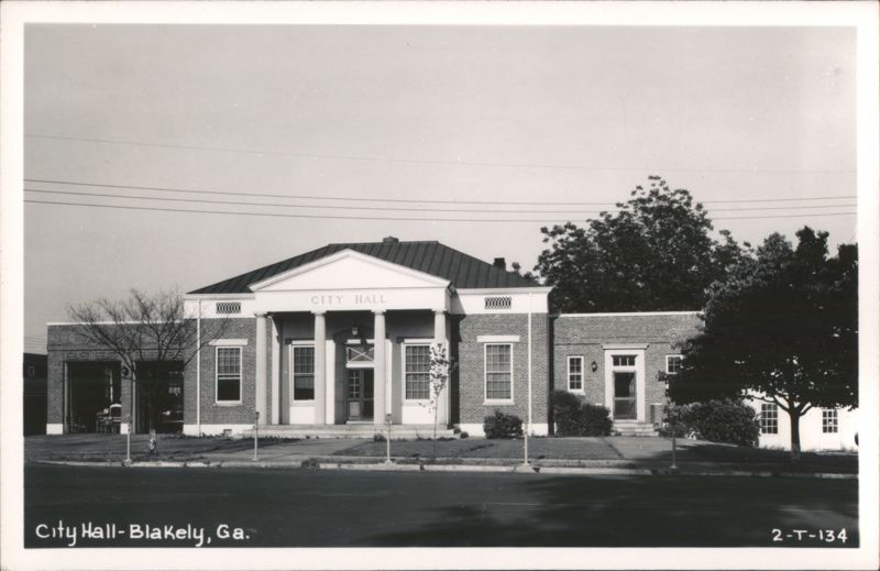 Exterior view of a one-story brick municipal building with a central portico supported by four columns. To the left is an open garage bay, possibly for a fire truck. A street is in the foreground and trees are in the background.