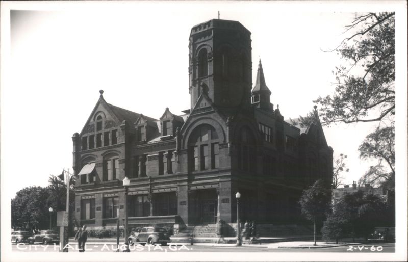 Black and white view of the large, multi-story brick building, featuring an octagonal tower, arched windows, and multiple gables. Vintage cars are parked on the street and people are visible on the sidewalk and stairs.