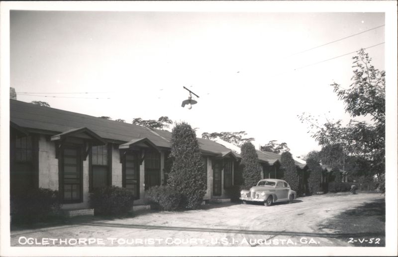 Black and white photo of a one-story tourist court or motel building. A vintage 1940s sedan is parked on a dirt driveway in front of the units. Conical evergreen trees line the driveway.
