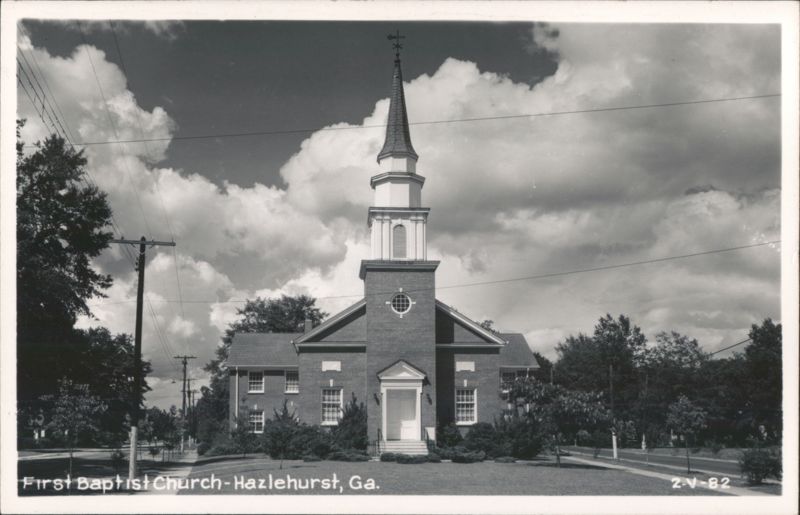 Front view of a brick church building with a tall white steeple, set against a cloudy sky. The church is surrounded by trees, a manicured lawn, and utility poles with power lines.