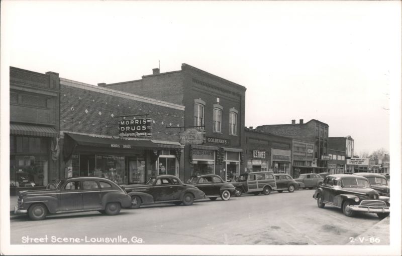 | View of a city street with cars from the 1940s parked along the side. Storefronts visible include Morris Drugs (a Walgreen Agency), Goldfarb's, and a U.S. Tires dealer. A theater in the distance is showing the movie "Where There's Life" starring Bob Hope. |