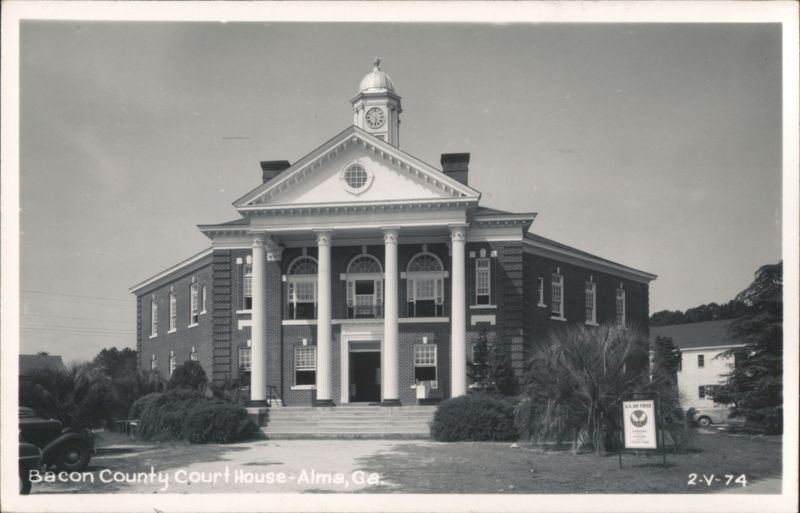 | A frontal view of the two-story brick courthouse, featuring a large portico with four white columns and a clock tower. A U.S. Air Force recruiting sign is visible on the lawn to the right. A vintage automobile is partially visible on the left. |