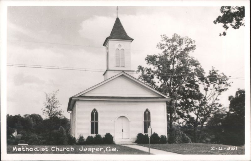 A white wooden church with clapboard siding, a steeple, two arched windows and an arched front door. The building is surrounded by grass and trees.