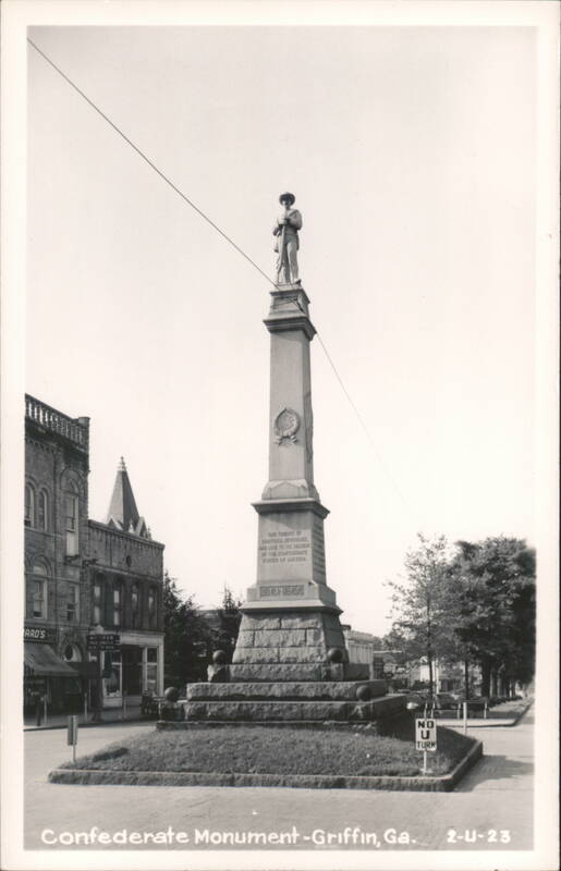 | A tall monument with a statue of a soldier on top, located on a grassy traffic island at an intersection. Multi-story brick buildings are visible in the background. An inscription on the base reads '1861-1865'. Another inscription reads 'OUR TRIBUTE OF GRATITUDE REVERENCE AND LOVE TO THE SOLDIERS OF THE CONFEDERATE STATES OF AMERICA.' |