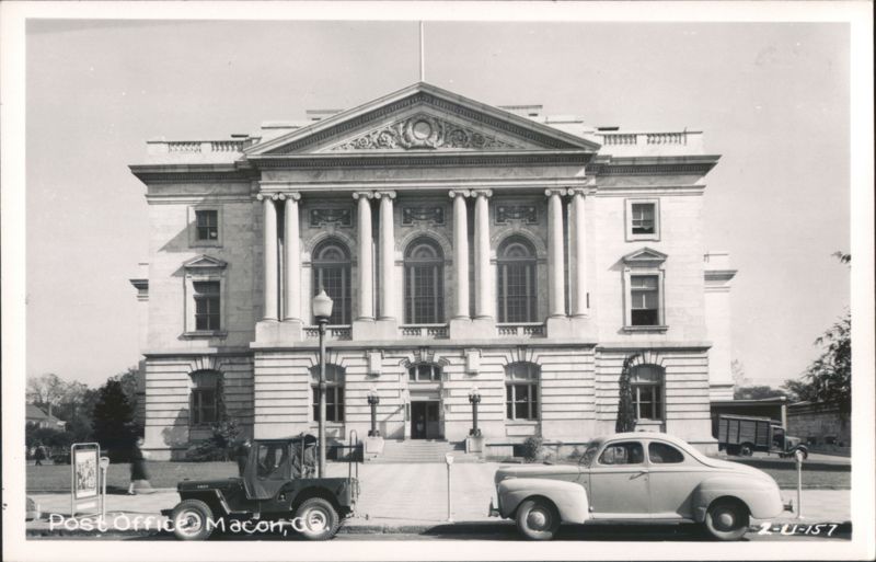 A front view of the large, neoclassical-style federal building. A Willys jeep and a 1940s coupe are parked at the curb. The building features a grand staircase leading to a portico with large Ionic columns and an ornate pediment.