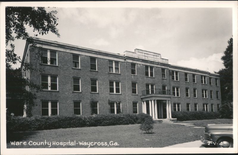 Exterior view of a three-story brick building with a columned portico over the entrance. A vintage car is partially visible in the lower right corner.