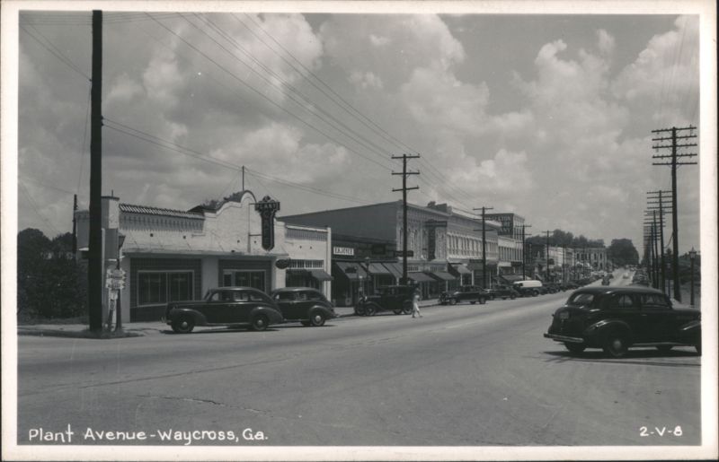 | Black and white view looking down a street lined with vintage automobiles. Storefronts are visible, including the Plant Cafe, E.H. Joyce, Rivenbark Furniture, and Singleton Furniture Company. A signpost points towards Augusta, Savannah, Jesup, and Albany on US Route 1. |