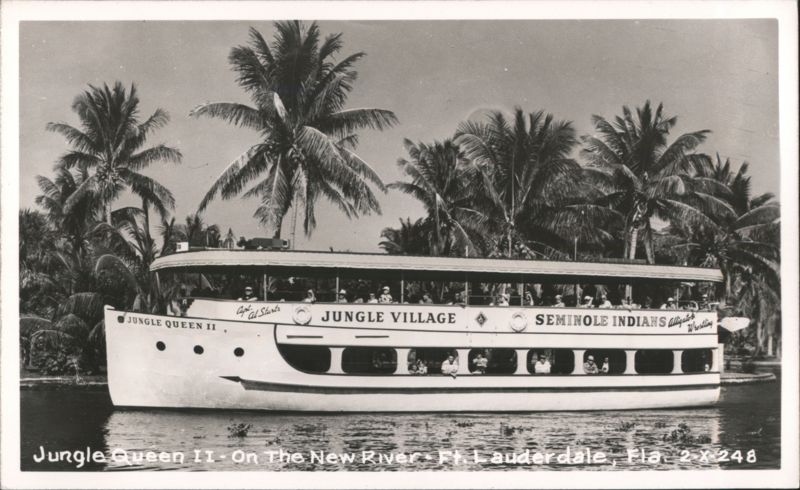 Passengers on a tour boat with text advertising 'Jungle Village', 'Seminole Indians' and 'Alligator Wrestling'. The boat is surrounded by palm trees. Handwritten text reads 'Capt. Al Starts'.