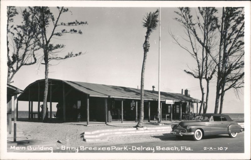 A black and white real photo postcard showing a long building with a curved roof next to a sandy beach and the ocean. A vintage convertible is parked on the road in the foreground. A sign for "Groceries" is visible on the building.