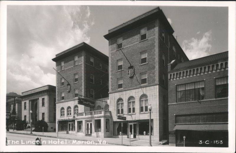 Street view of a multi-story brick hotel with a lower level made of stone. A flag hangs from each of the two main towers of the hotel. To the left is another large building and a vintage car is parked on the street.