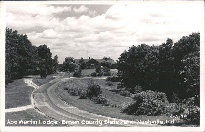 A view of the winding road leading up to the Abe Martin Lodge, surrounded by trees and rolling hills under a cloudy sky.