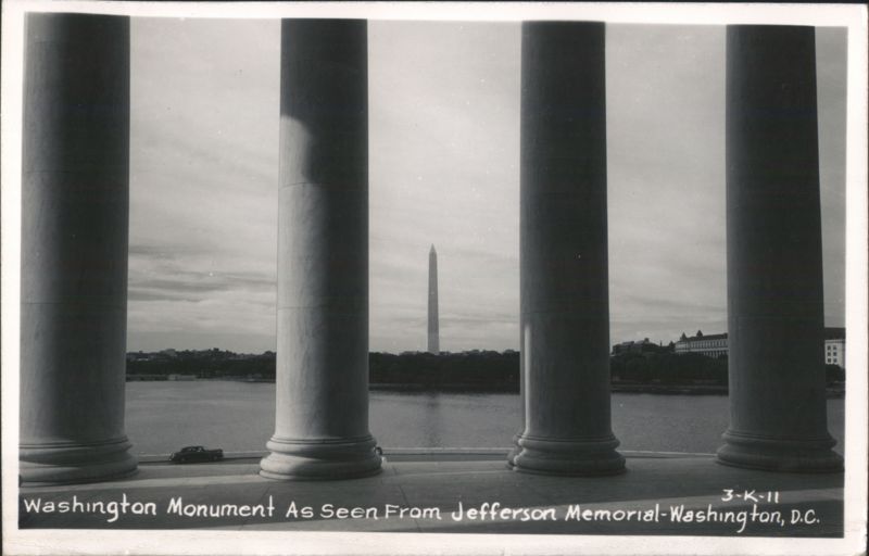 A view of the Washington Monument in the distance, seen across the Tidal Basin and framed by four large columns of the Jefferson Memorial. A vintage car is parked on the promenade in the foreground.