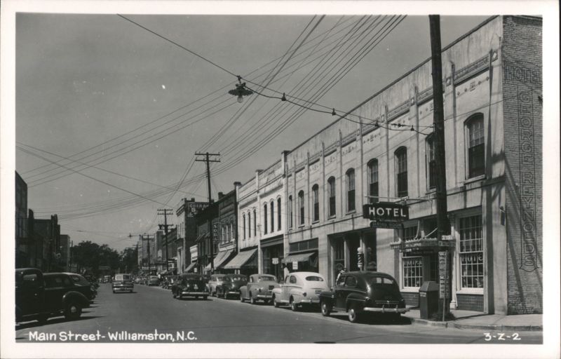 | A view looking down Main Street, lined with parallel-parked cars from the 1940s. On the right is the Hotel George, which also has a dining room and a barber shop, indicated by a barber pole. Further down the street, signs for a Guaranty Bank and a soda shop are visible. The street is crisscrossed by numerous overhead utility wires. |