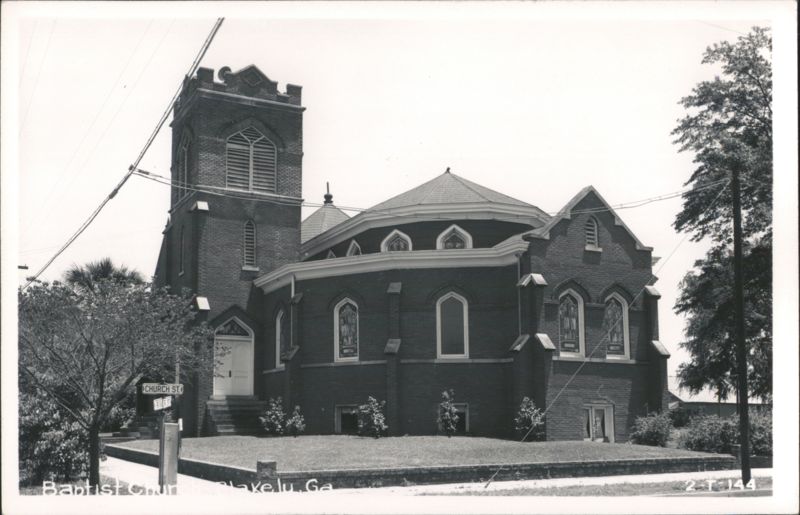A black and white real photo view of a brick church on a corner lot. A street sign shows the corner of Church St. and River St. The church has a square tower, arched windows, and an octagonal section. It is surrounded by a low brick wall, a lawn, and some small trees and shrubs. |