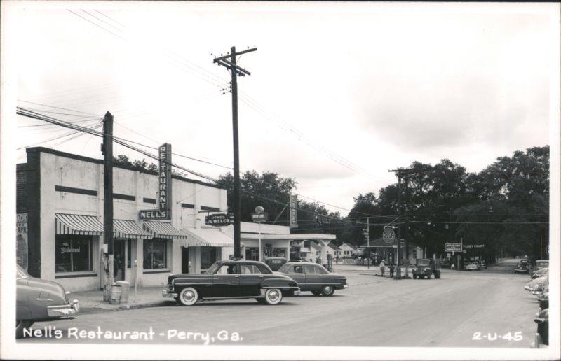 | A black and white photograph of a street corner with several businesses. A prominent vertical sign reads "RESTAURANT" above "NELL'S". The building also houses "JONES JEWELER" and has striped awnings. Several vintage cars are parked along the street. In the background, signs for a Gulf gas station, "USED CARS", and "PERRY COURT" are visible. Another sign indicates "STANDARD OIL PRODUCTS". |