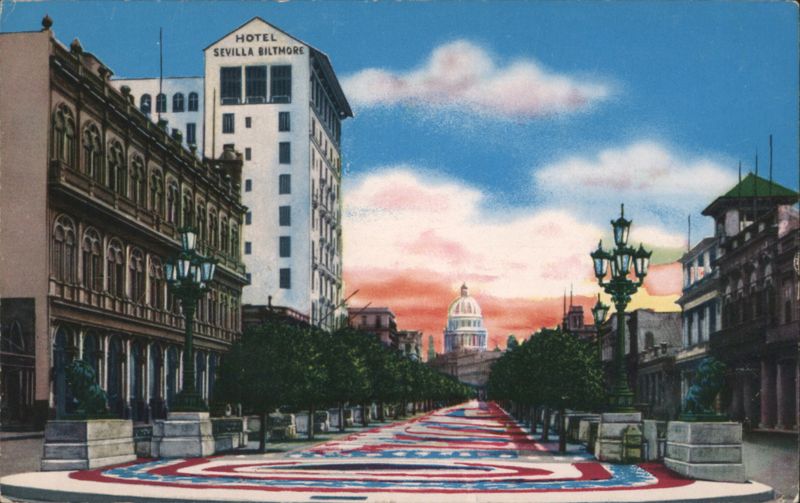 A view down the Paseo de Marti, also known as the Prado, in Havana. The Hotel Sevilla Biltmore is on the left, and the Capitolio Nacional can be seen in the distance. The boulevard is decorated with a large red, white, and blue carpet.