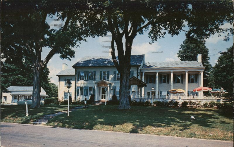 | View of the Sachem Country House on Goose Lane. Text on the back reads: "‘For the ultimate in dining pleasure’ New England's finest Inn. food prepared by your host, Andrew Valente, Chef, director. Cocktails and Wines." The building is shown with large trees in the front yard and an outdoor patio with umbrellas. |