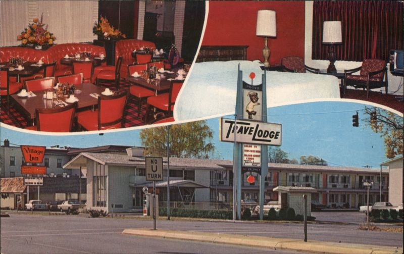 Montage featuring the exterior of the motel, the interior of the Village Inn restaurant with red booths, and a motel room. The TraveLodge sign lists amenities like Color TV, King Size Beds, and a swimming pool. The property is located at First South and University Avenue. |
