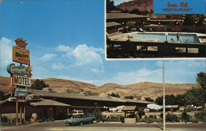 Exterior view of the Green Well Motel with its large Best Western sign, and a car parked out front. An inset picture shows the swimming pool and restaurant. The motel had locations in Moab and Price and advertised a restaurant, cocktail lounge, heated pool, color T.V. and refrigerated air conditioning. |