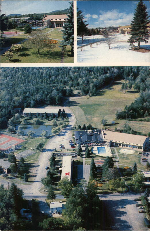 Aerial view of the Villaggio Resort, described as a 'Leading Northern Catskills Four Seasons Vacation Land.' The complex features multiple buildings, a swimming pool, tennis courts, and a pond nestled in a wooded area. Inset images at the top display the resort in both green and snowy seasons. |