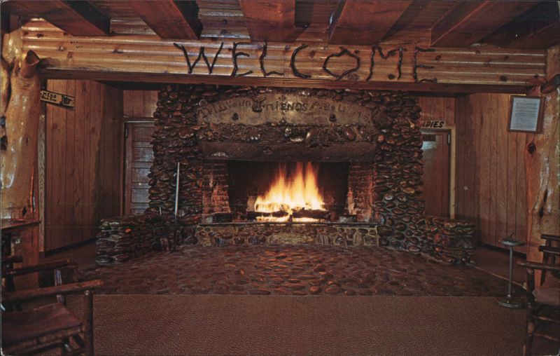 This shows the interior of Ruby's Inn Lodge at Bryce Canyon, Utah. The huge fireplace provides heat, light, and a friendly Western atmosphere.