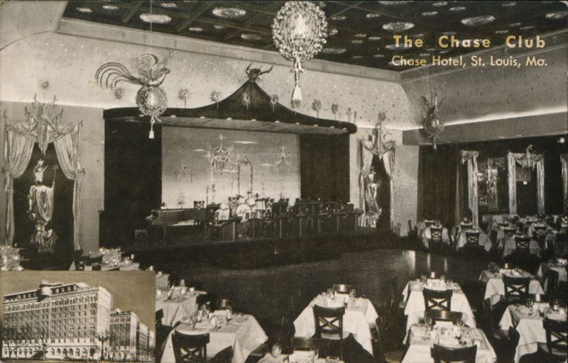 The Chase Club, designed and decorated by Tony Duquette, is St. Louis' most famous showplace and has been called the most beautiful night club in America. It has movable walls and can be expanded to seat one thousand guests. America's top stars and name bands entertain here nightly at dinner and supper. |