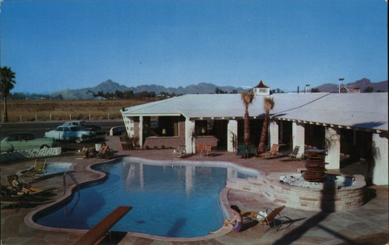 Located at 2745 E. Van Buren on Highway 80, the Desert Hills motel featured 60 rooms, refrigerated air conditioning, a coffee shop, and dining room. The grounds featured one of the most beautiful pools in Phoenix. Affiliated with Desert Inn. |