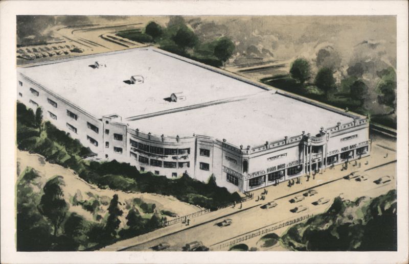 | An architectural rendering of the large, white Koos Bros. furniture store, featuring Art Deco design elements on its facade. Cars are shown in the parking lot and on the street in front of the building, which is surrounded by manicured shrubs and trees. |