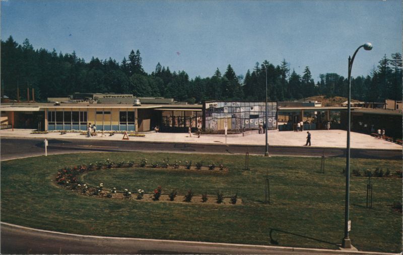 View of the mid-century modern entrance to "The West's newest Exotic 'Zoo'", featuring a prominent colorful mosaic mural at the center and a large, crescent-shaped flower bed on the lawn in the foreground.