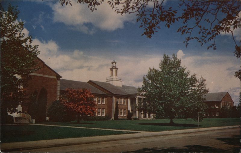 View of brick university buildings featuring a central white cupola, set on a manicured lawn with green and red-leafed trees under a blue sky with scattered clouds.