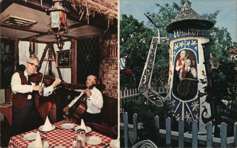 | Composite view of the Hofbraugarten German Village. On the left, musicians Fritz Reimann and Michael "Pop" De Rudder perform their mini-symphony in the cozy Garden Room dining area. On the right, a view of the flower-covered patio featuring a large decorative stein with the word "Willkommen" and an artistic depiction of the musicians. |