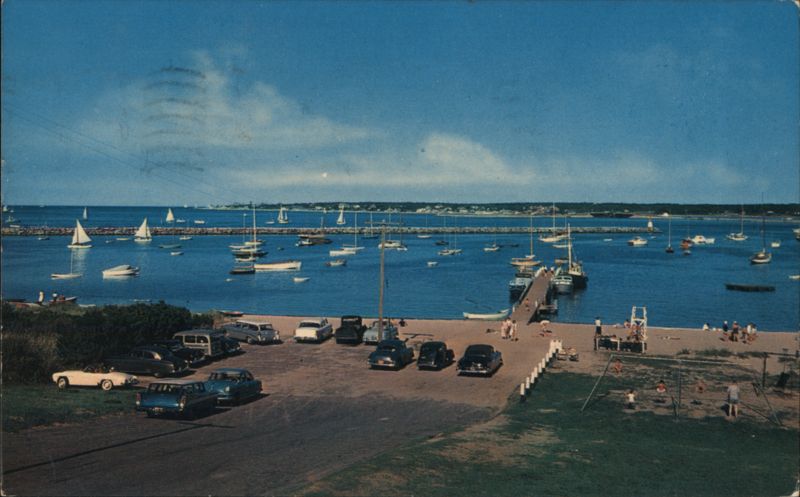 The harbor and bathing beach as seen from Owen Park, Vineyard Haven, on Martha's Vineyard Island. This large harbor is ideal for even the largest sailing craft.