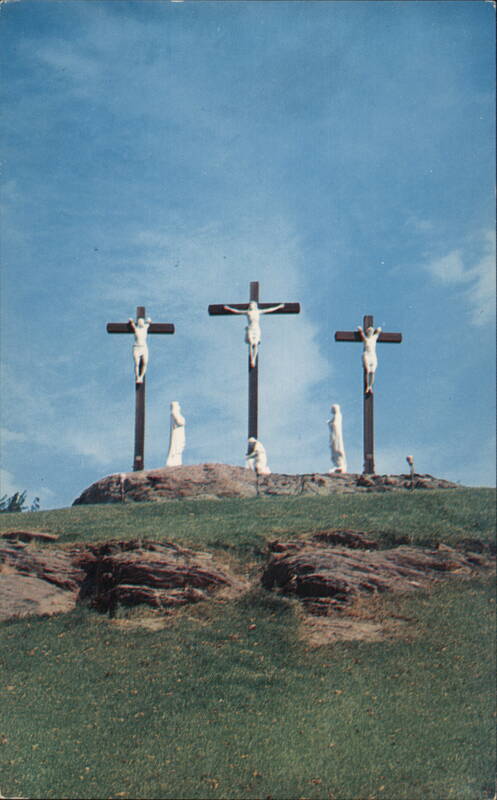 Scene depicts the three crucifixes of Calvary on a grassy hill. This installation is located at the Our Lady of Fatima Retreat House, run by The Oblates of Mary Immaculate.