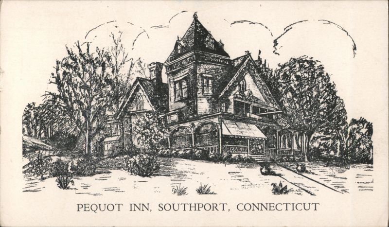 A sketch of the Pequot Inn, a large Queen Anne style building with a prominent corner tower and a wraparound porch, surrounded by mature trees and landscaping.