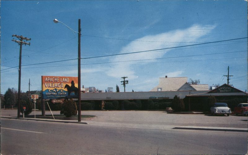 Street view of the Apache Land Village complex, featuring a shopping center, cafe, and the Growlery Market. A large sign with a silhouette of a person on horseback advertises the complex. A white Volkswagen Beetle is parked in the lot. According to the text on the back, the cafe served meals from 6 A.M. to 9:30 P.M. and was located on U.S. Highways 60 and 70. |