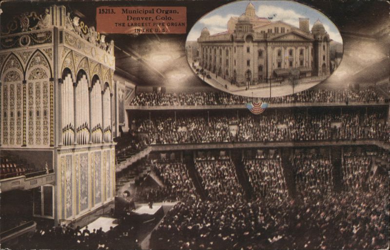 The interior of an auditorium packed with people, featuring what is described as "The Largest Pipe Organ in the U.S.". An inset oval image shows the exterior of the building.